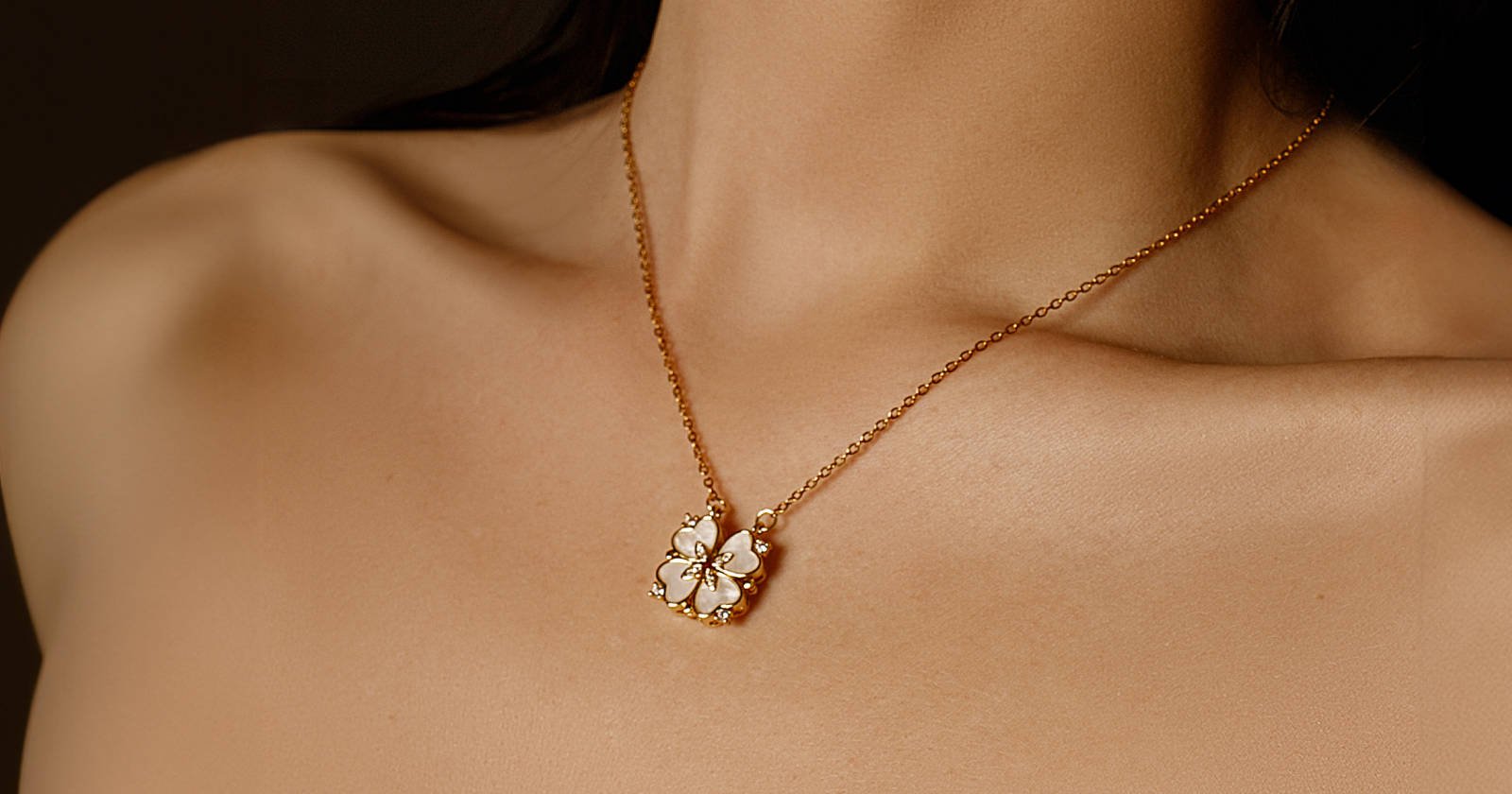 Un collier doré délicat qui se révèle à la fin, comme un cadeau précieux.